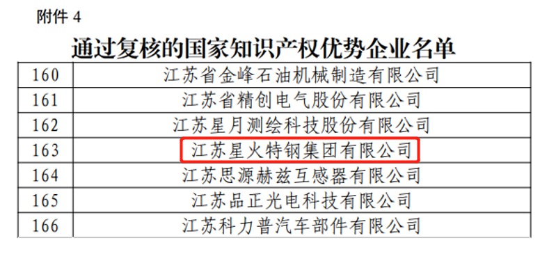 江蘇星火特鋼集團通過復核2022年新一批及國家知識產權優勢企業
